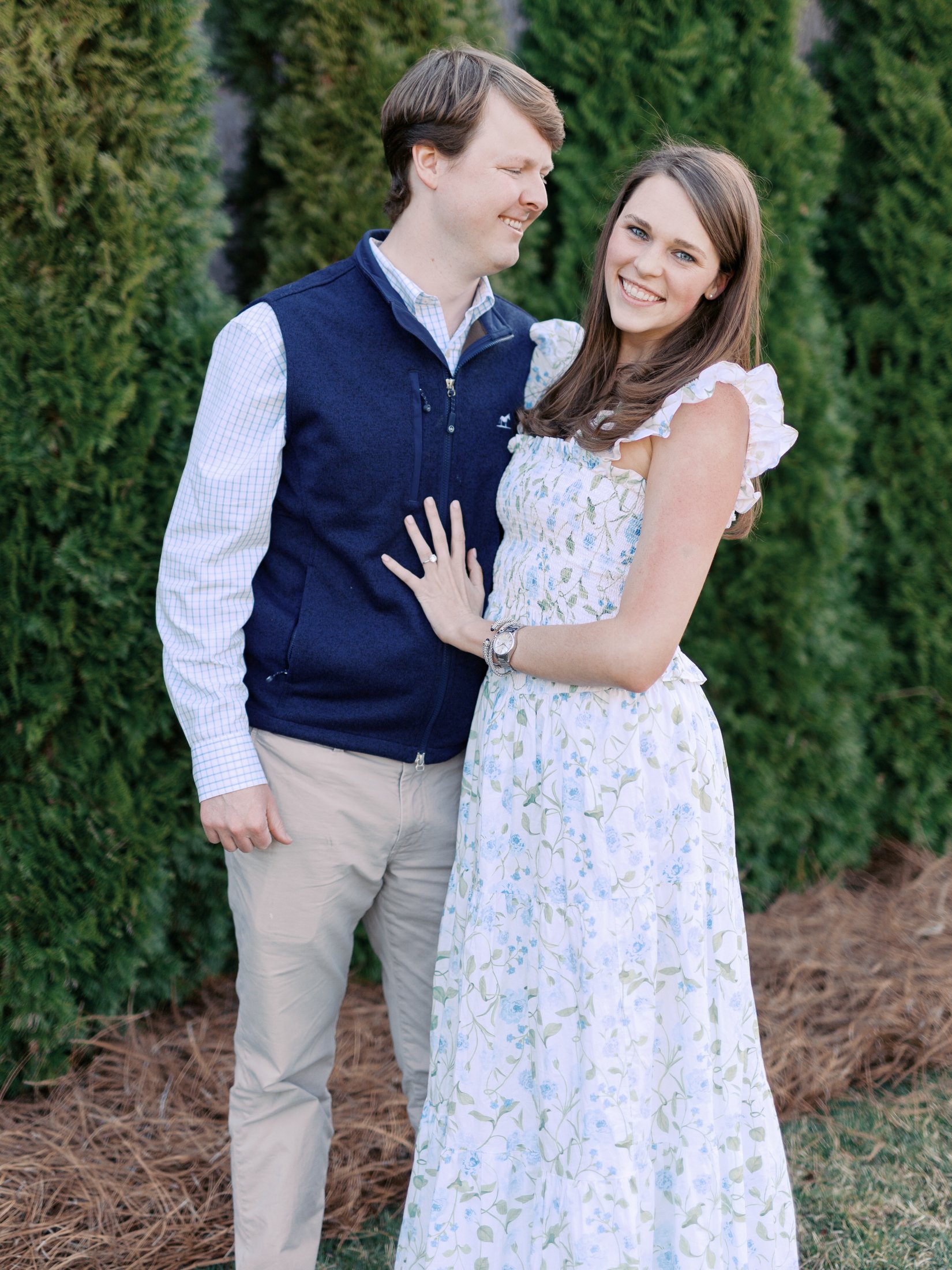 A smiling young woman in a floral dress with ruffled sleeves standing next to a man wearing a blue vest and beige pants, with her hand on his chest, outdoors with greenery in the background.
