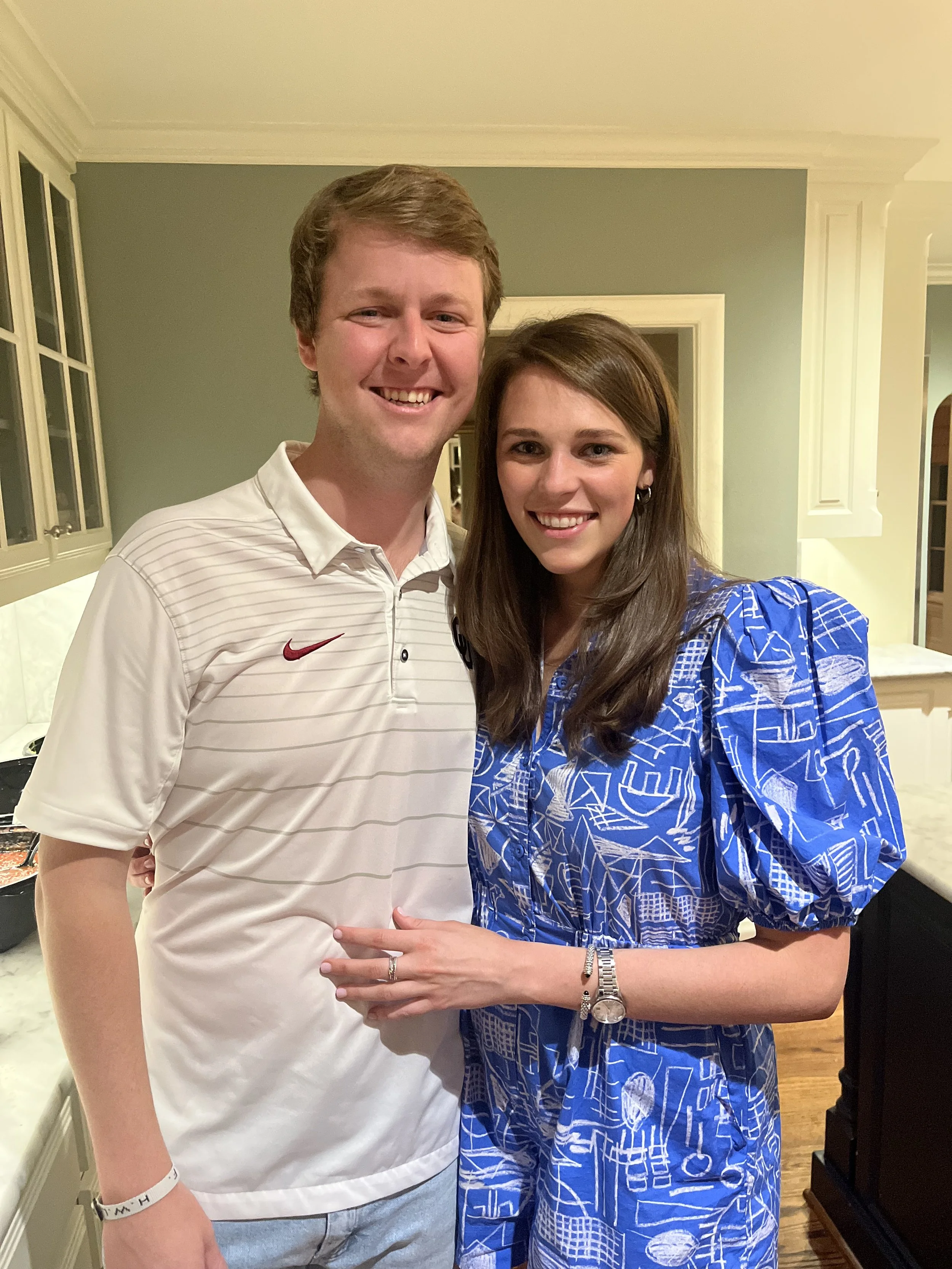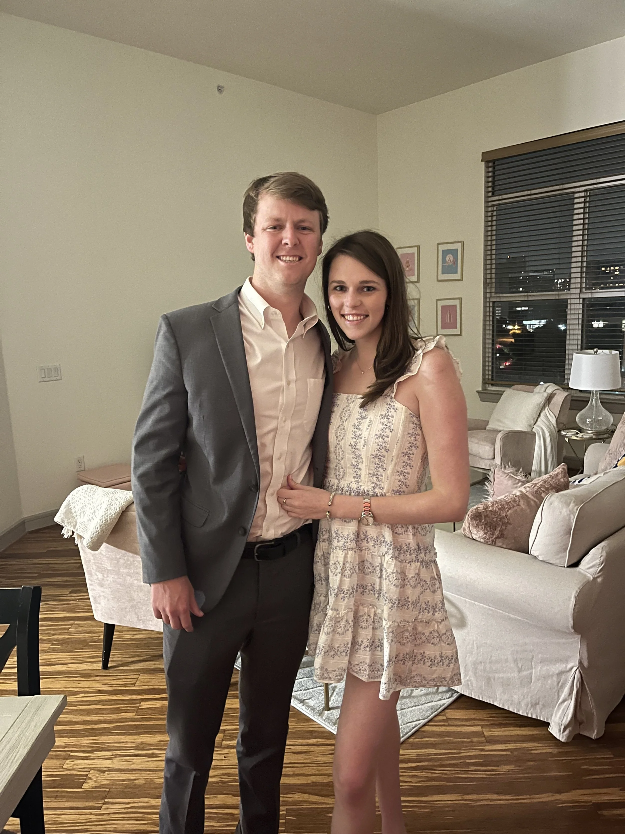 A smiling young man and woman standing close together in a living room at night, dressed in semi-formal attire. The man is wearing a gray blazer and white shirt, while the woman is wearing a floral dress.