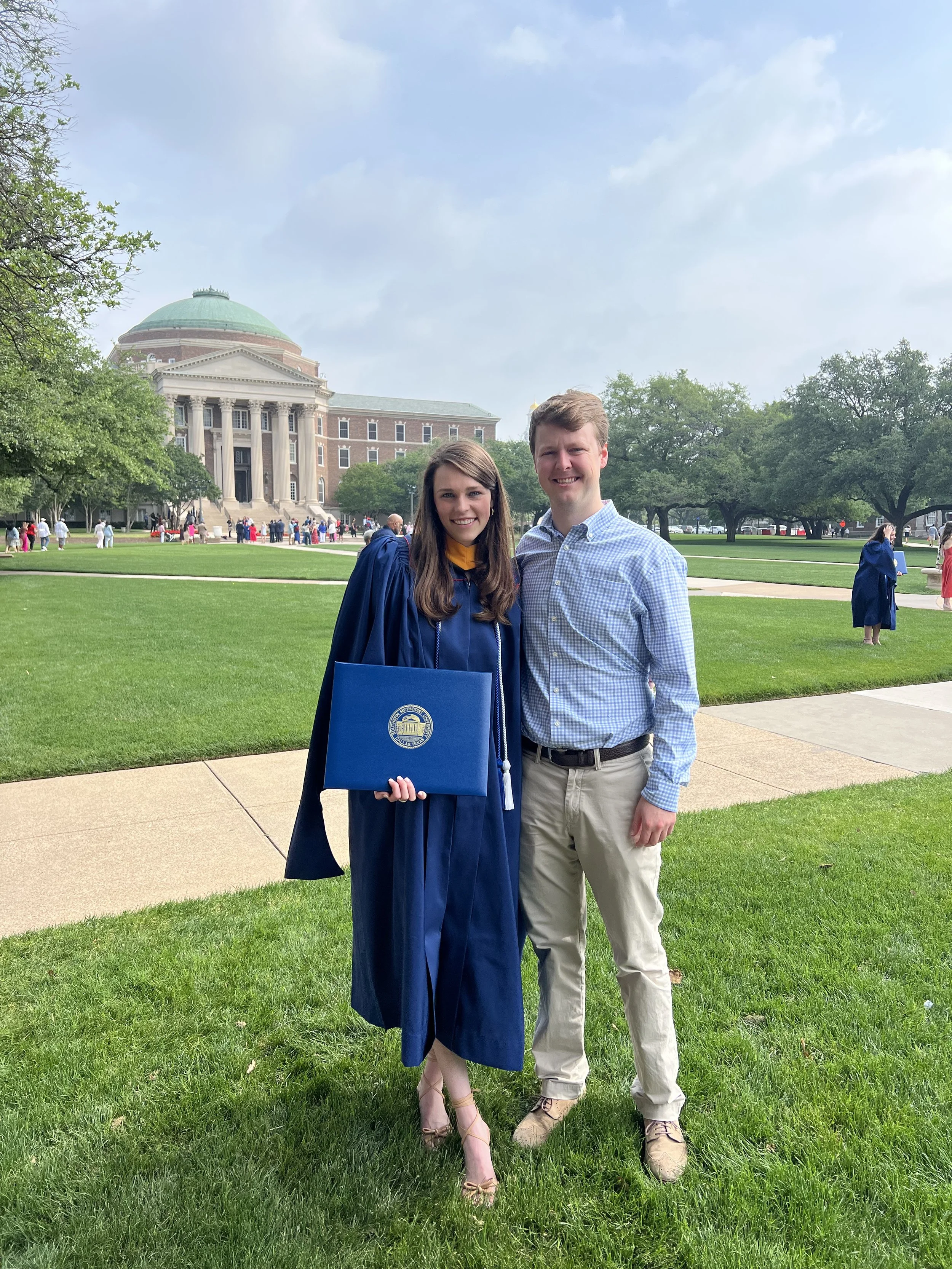 A young woman in a graduation gown holding a diploma standing next to a man on a university campus with a large classical-style building in the background.