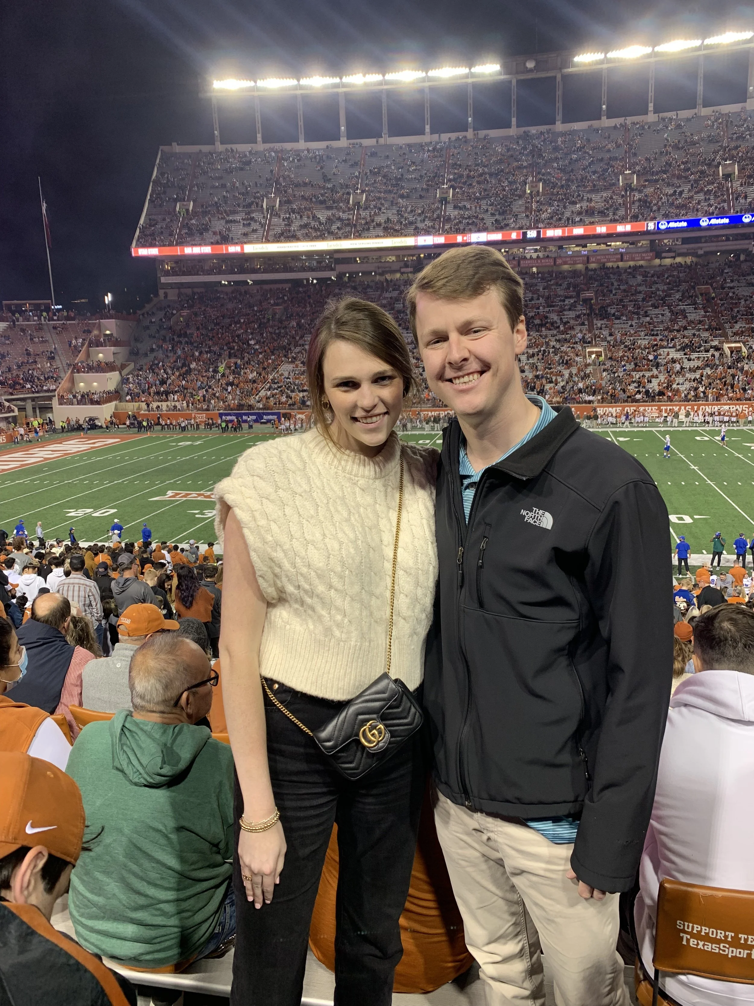 Two smiling people, a woman in a cream sweater and a man in a black North Face jacket, standing in a football stadium during a game with a cheering crowd in the background.