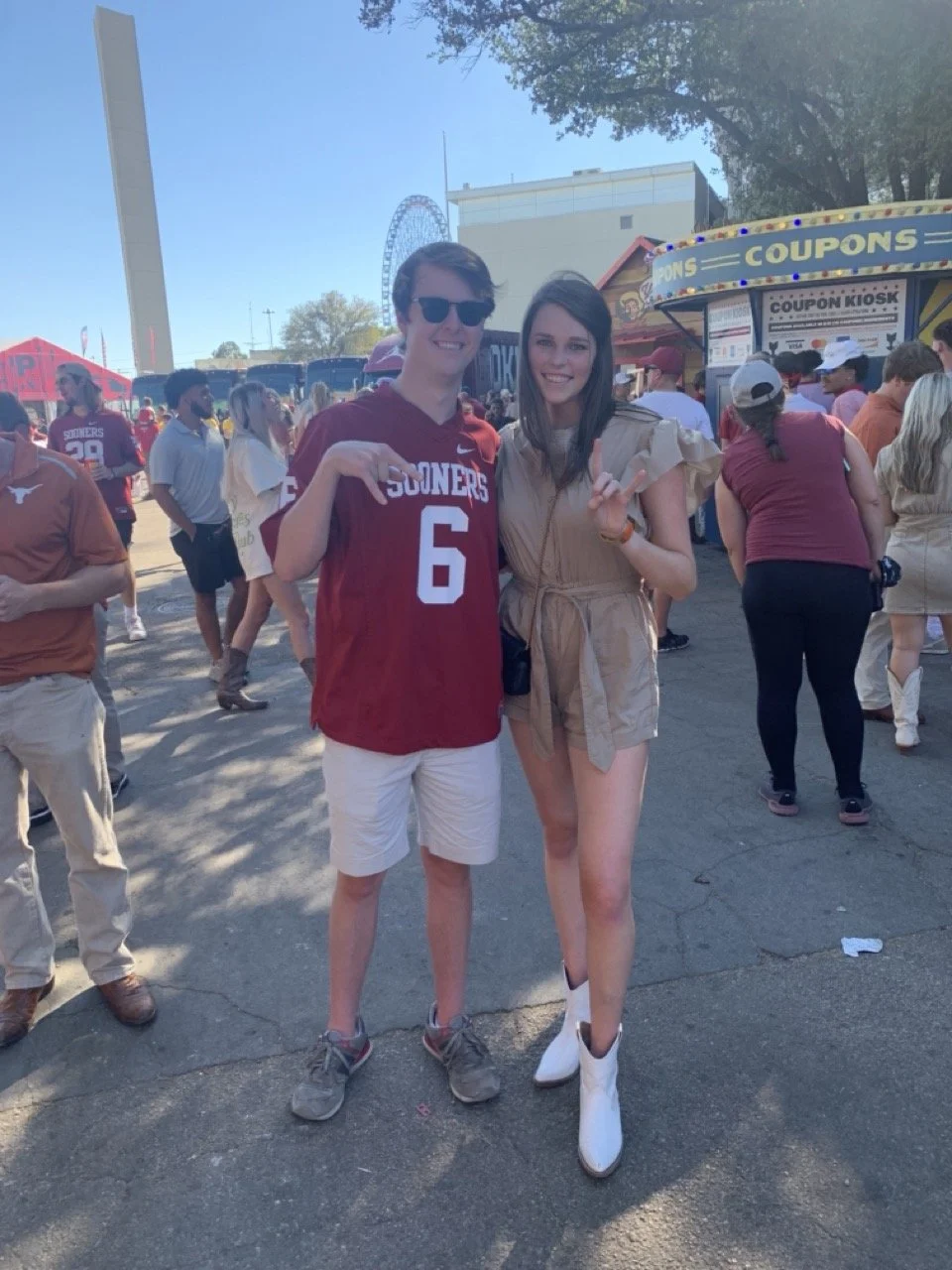 A man and woman posing for a photo at a football game, the woman wearing a white dress and the man wearing a white Oklahoma University polo shirt, with a packed stadium of spectators in the background.