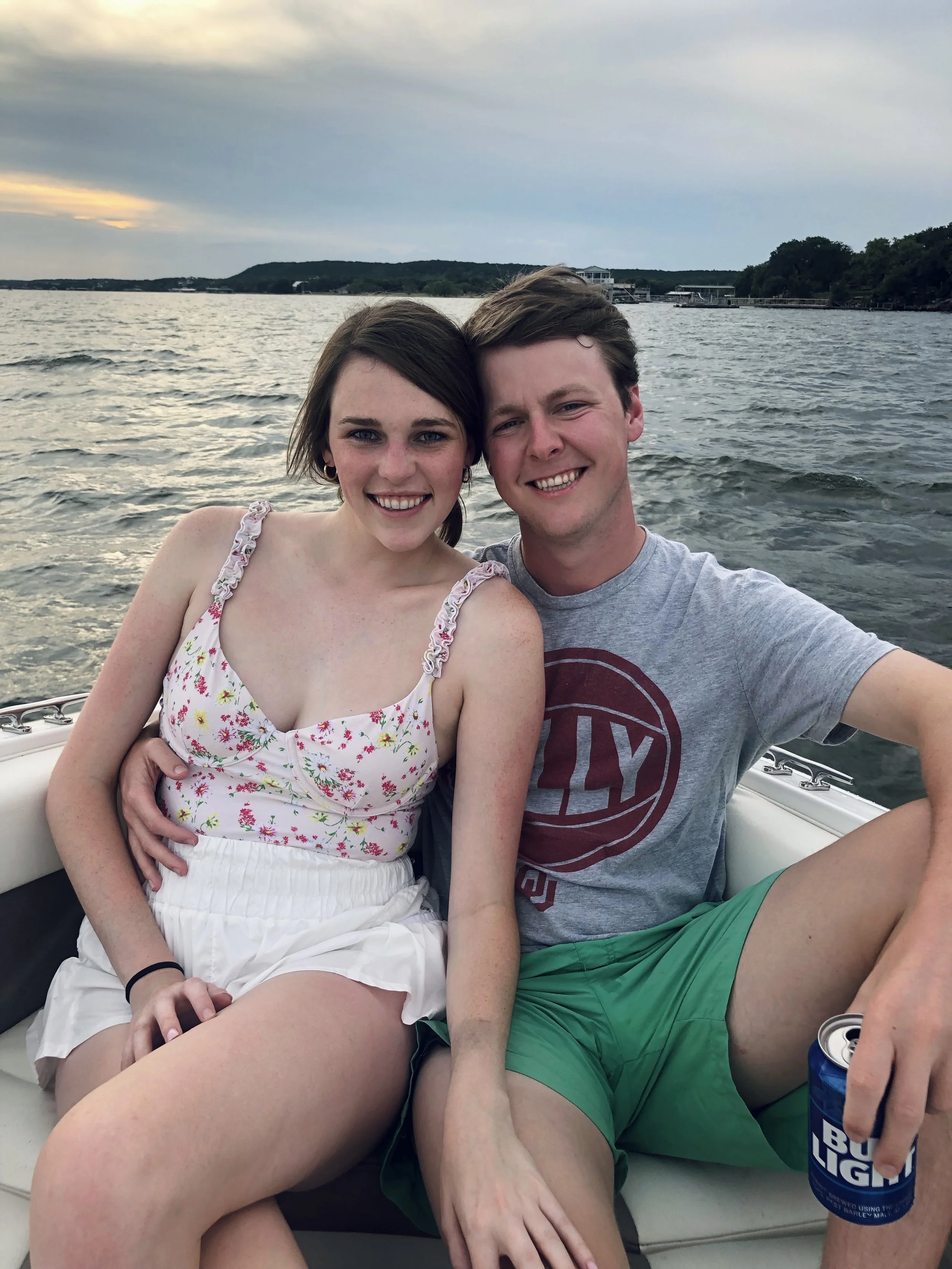 A young couple is sitting close together on a boat with water and a distant shoreline behind them. The woman is wearing a white floral tank top and shorts, and the man is wearing a gray T-shirt and green shorts. They are smiling and appear to be enjo
