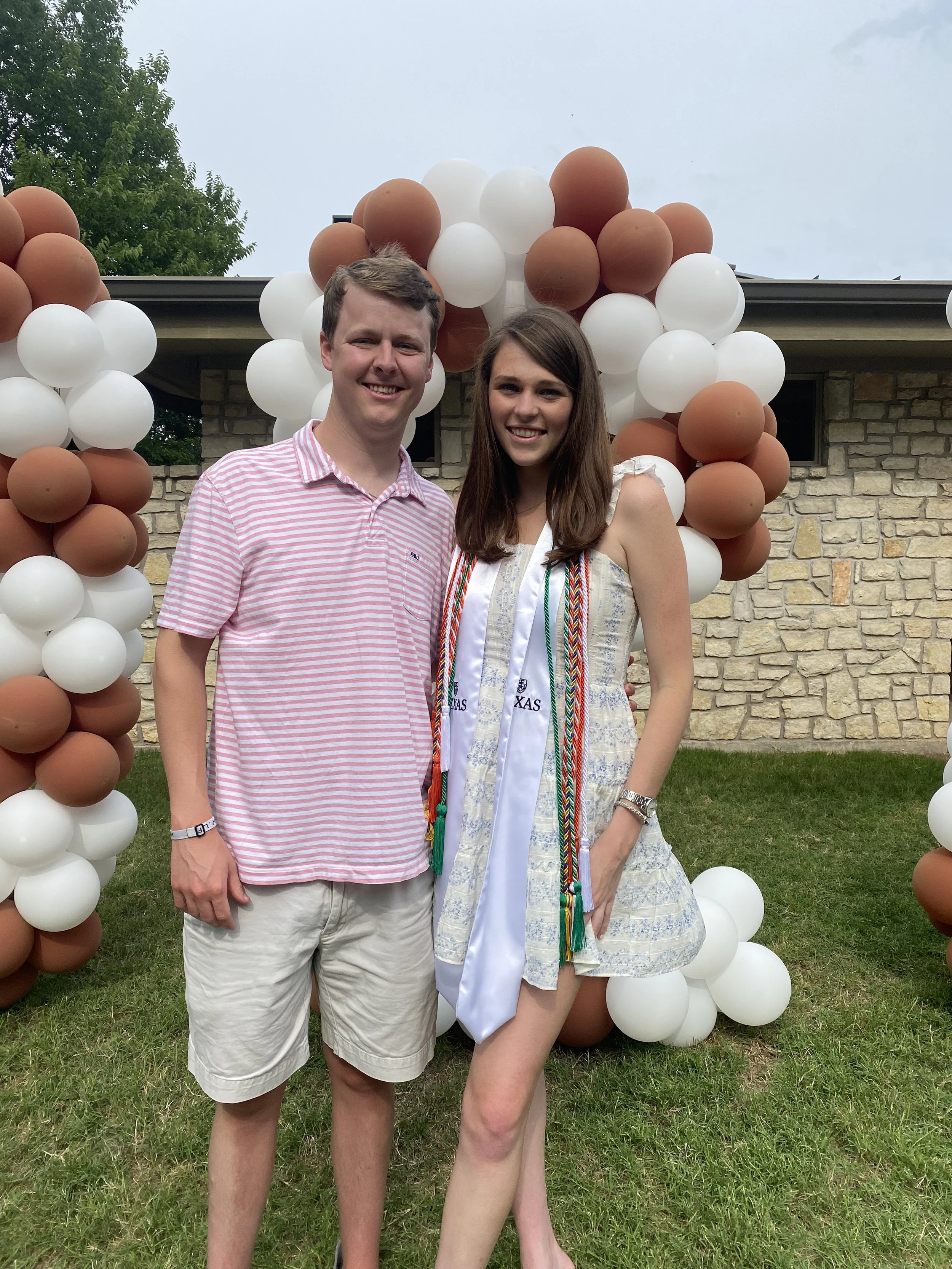 A young woman in a graduation gown and cords standing next to a young man in casual clothing outdoors, with an arch made of brown and white balloons behind them.