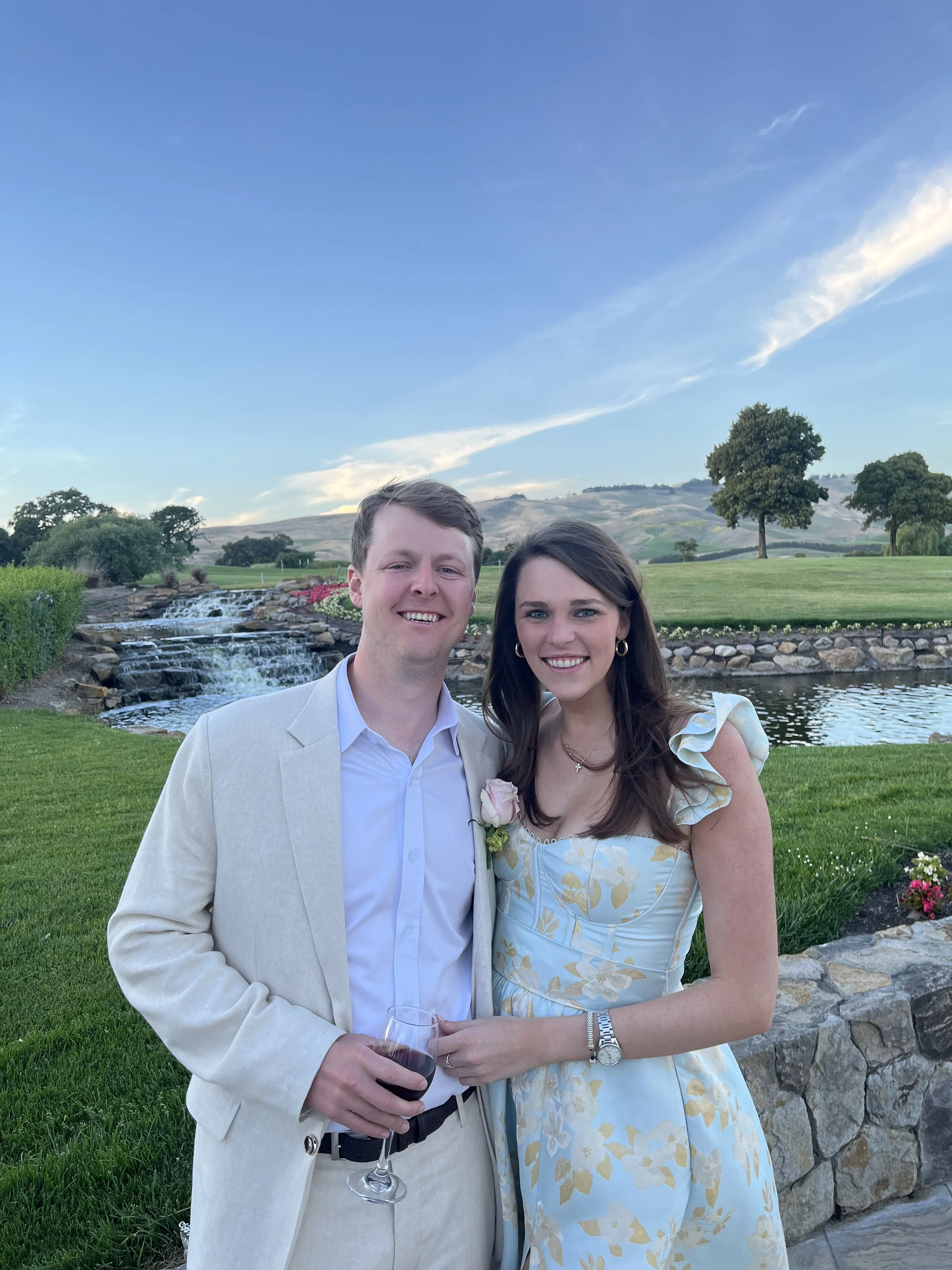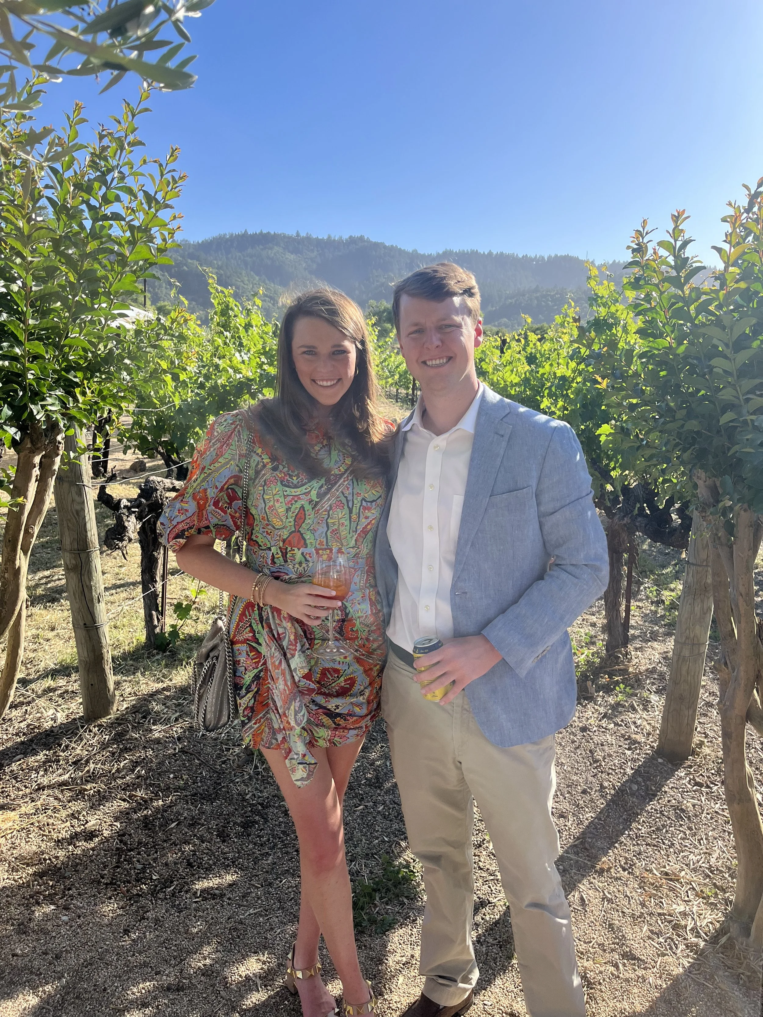 A woman and a man standing together outdoors in a vineyard, smiling at the camera. The woman is holding a glass of wine, and the man is holding a can. It's a sunny day with clear blue skies and green hills in the background.