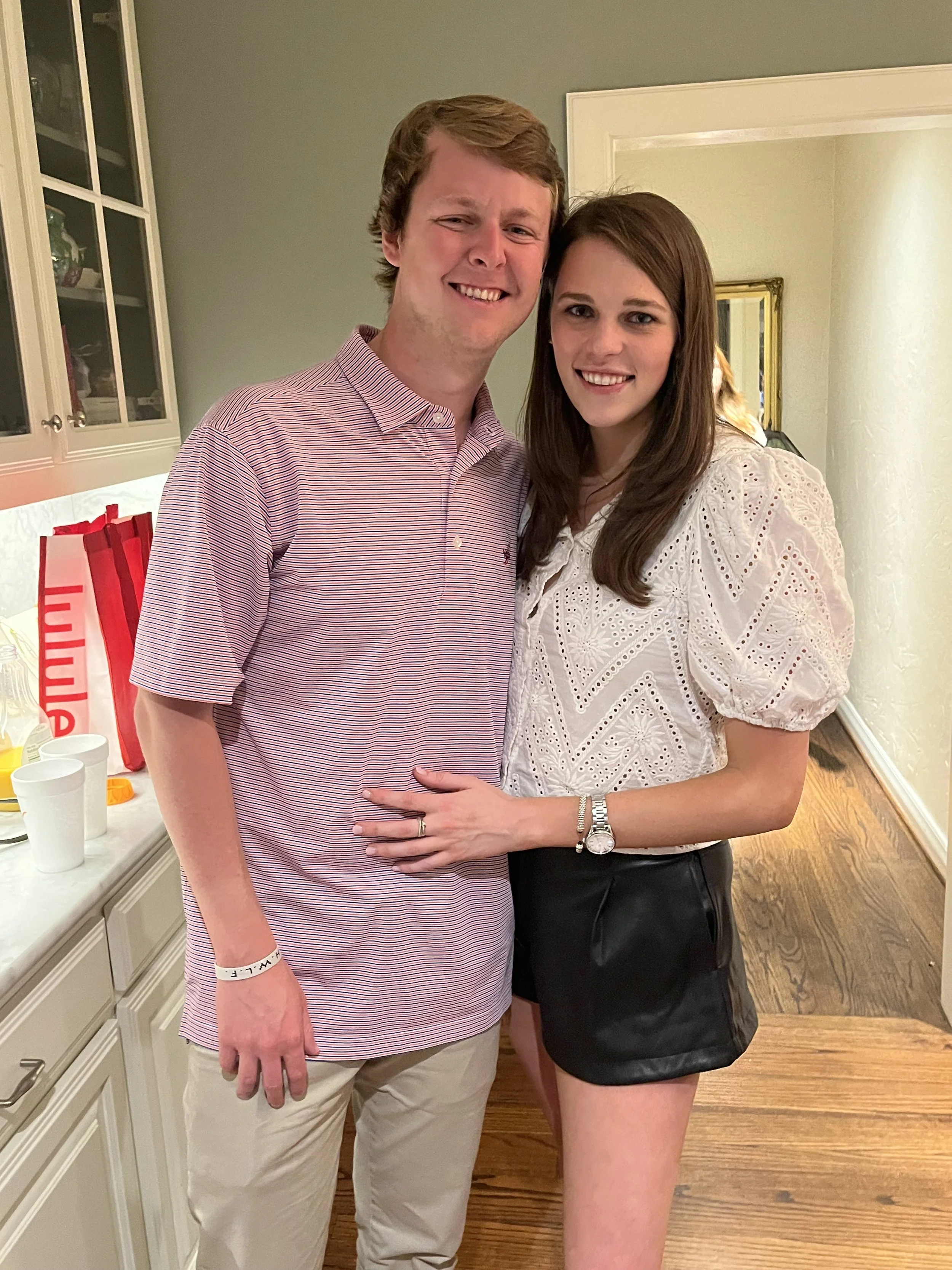 A smiling young man in a white polo shirt and a young woman in a blue patterned dress standing together in a kitchen.