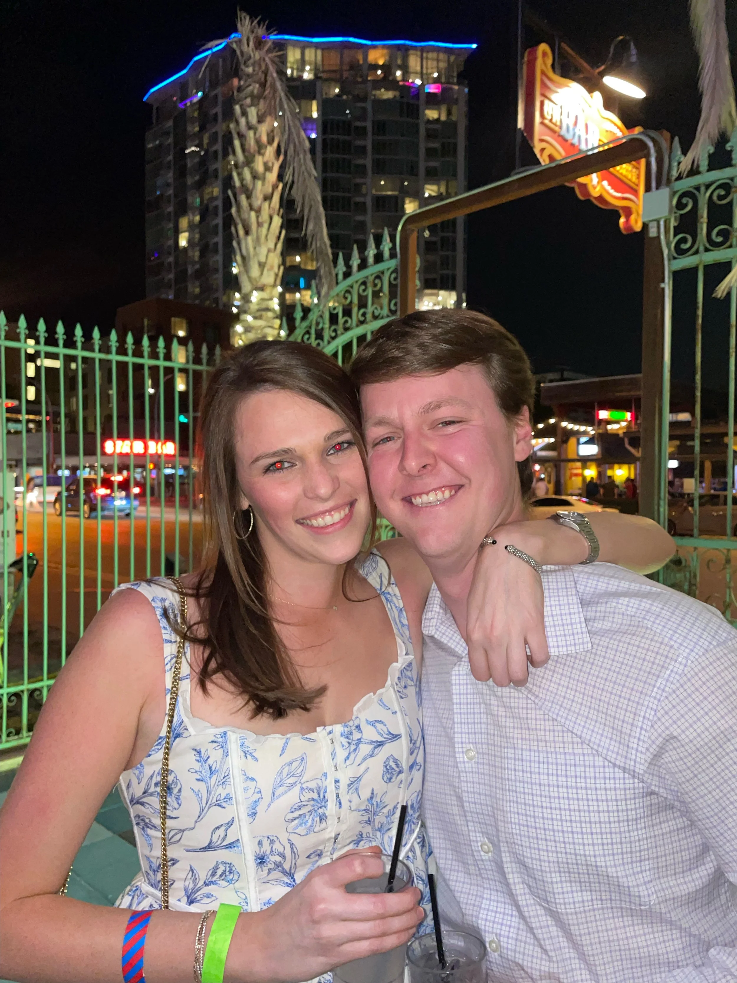 A smiling young woman and a young man with light skin pose closely at night. The woman has long brown hair, is wearing a white dress with blue floral patterns, and has a blue and red wristband. They are in front of a green metal fence with a neon-lit