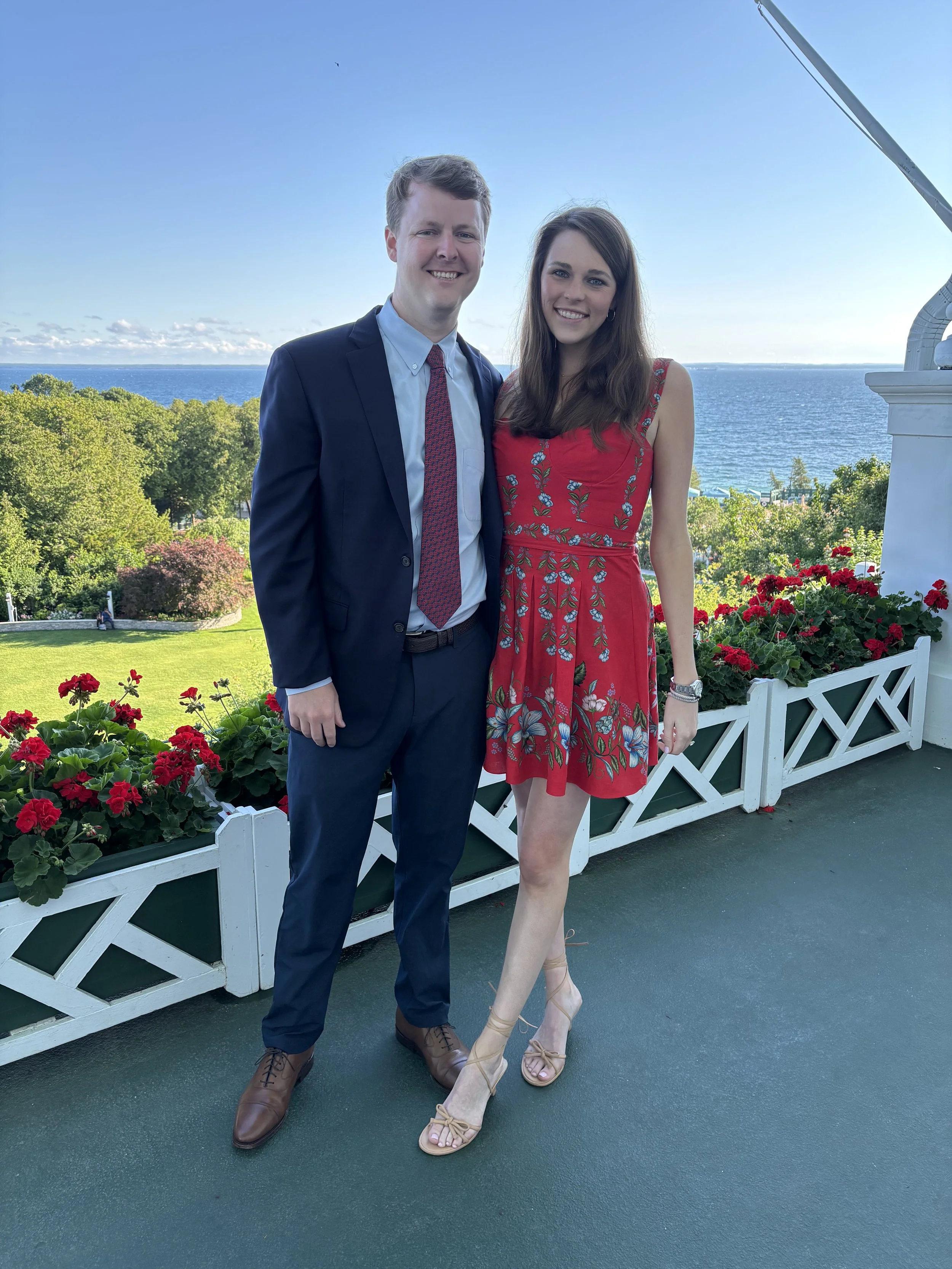 A young woman in a purple dress and a young man in a striped shirt and shorts standing outdoors on a stone pathway with green grass, Adirondack chairs, a lake, trees, and mountains in the background.
