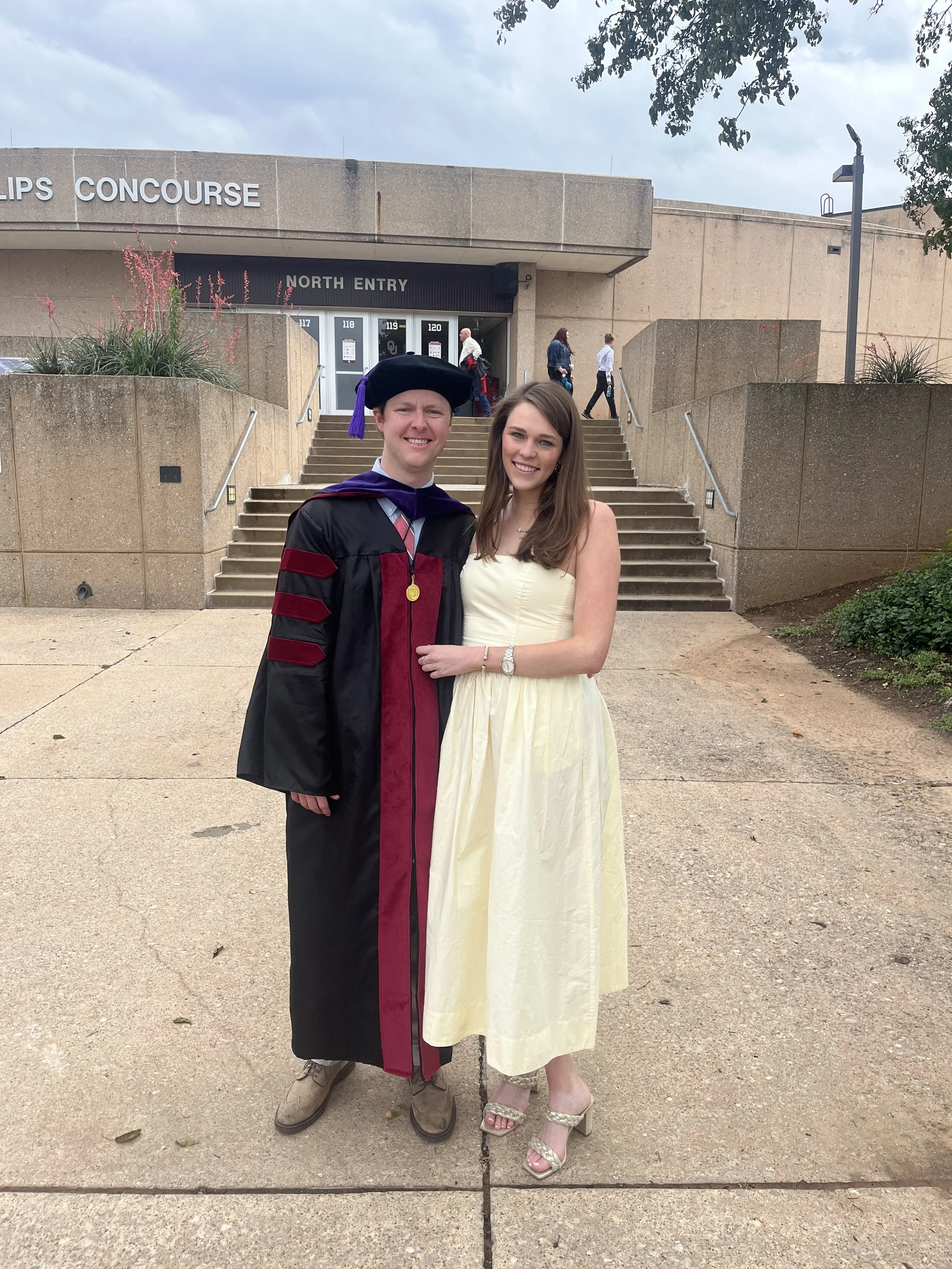 A young man in a university graduation gown and cap standing next to a young woman in a yellow dress outside of a building with stairs, with other people walking in the background.