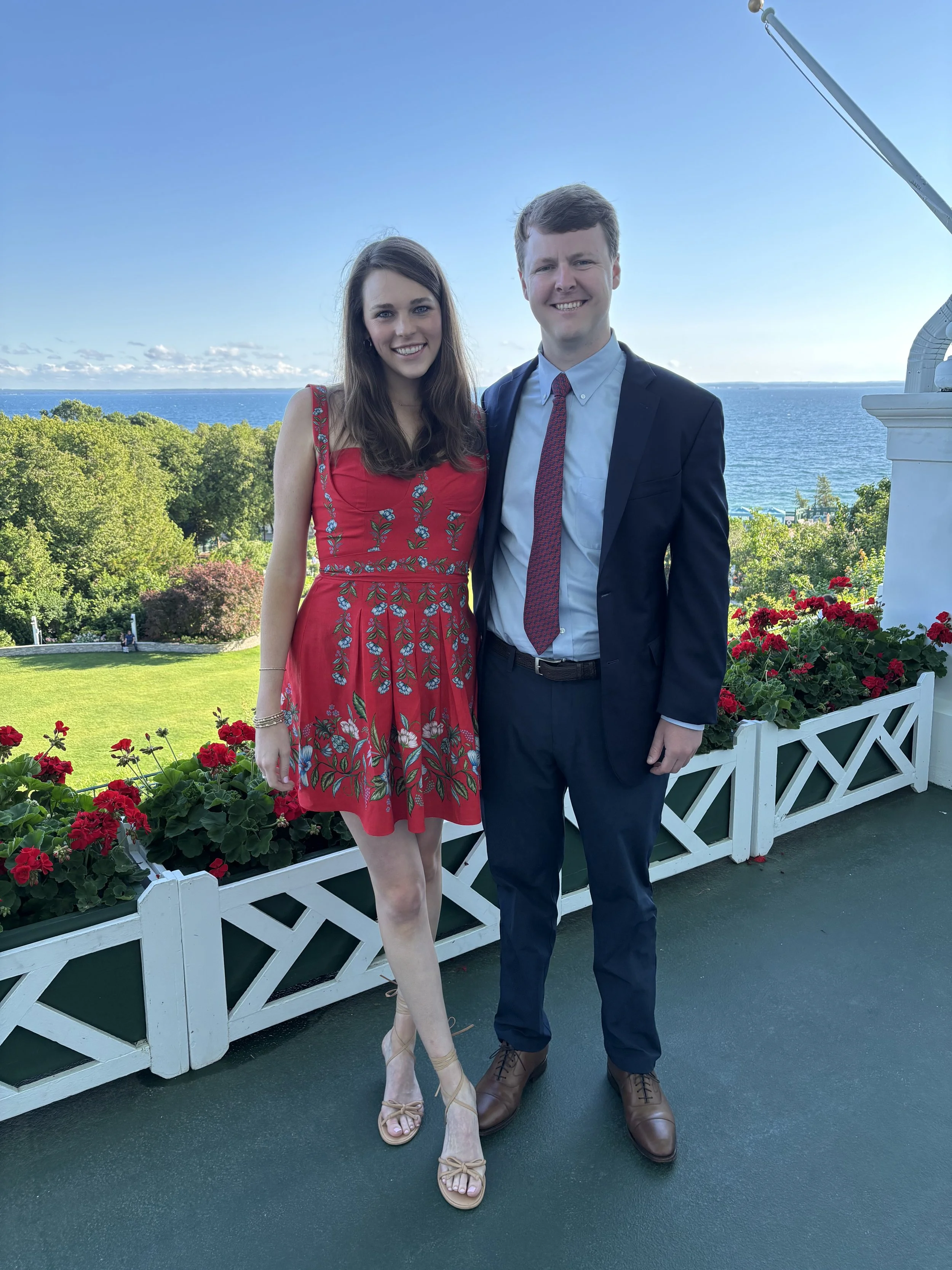 A young man and woman standing outdoors, smiling, with green bushes in the background. The man has brown hair and is wearing a blue vest over a light blue checkered shirt. The woman has long brown hair and is wearing a white dress with a floral patte