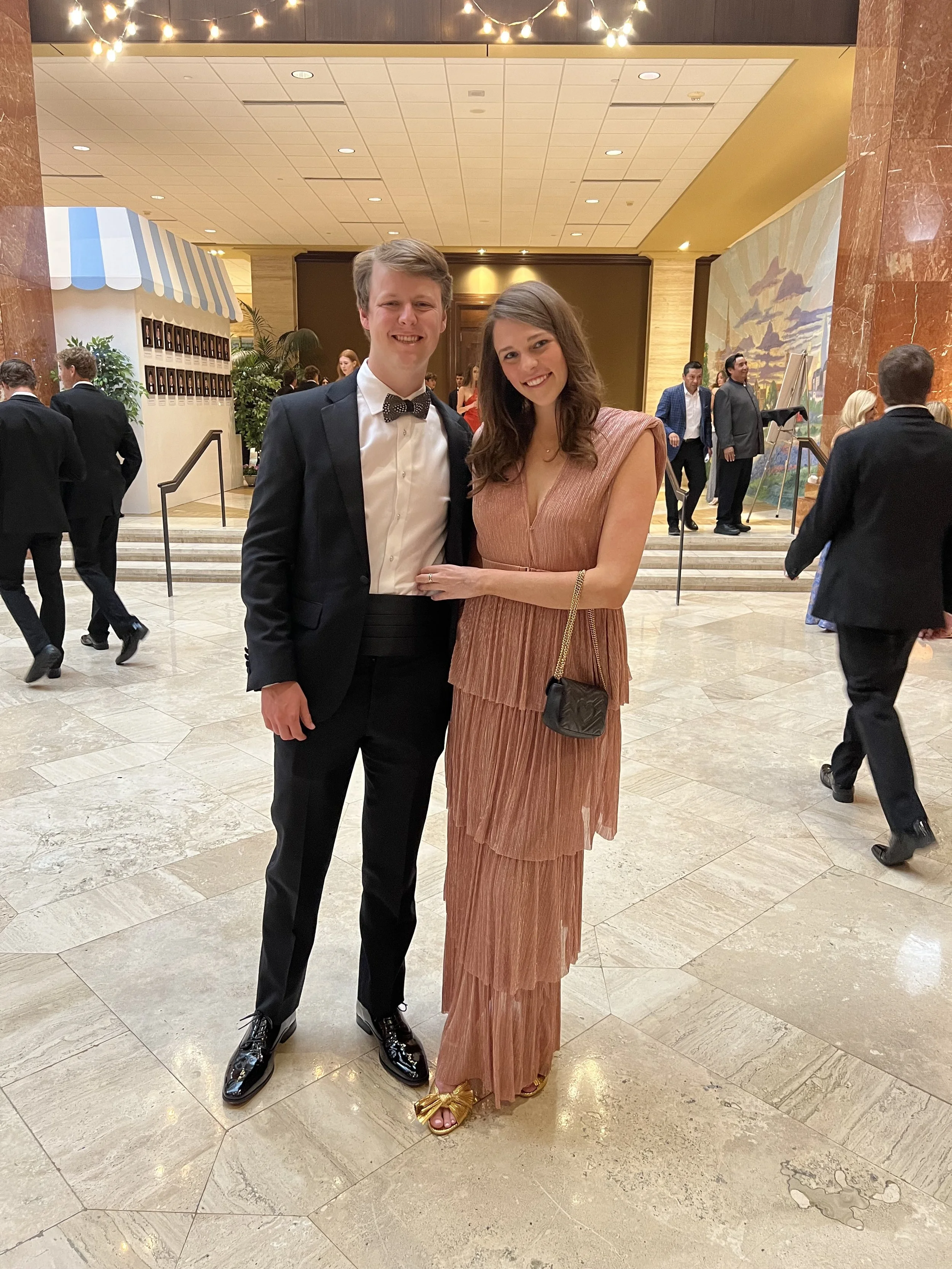 A young man and woman dressed in formal attire standing together in a hotel lobby with other guests in the background.